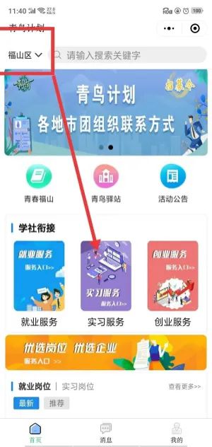 5、点击“草榴社区—实习岗位”→左上角选择所在县市区→实习服务→选择心仪的岗位投递简历即可。