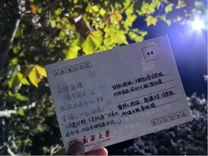 一张小小的明信片从新疆飞来,是思念的具体化,也是打开时光宝盒的钥匙。已些许泛黄的记忆如电影般放映,历历在目。高中三年我们是并肩作战的战友,在名为高考的战场上厮杀。所积累下的情谊让我们在分别后格外想念对方。“飞鸽传信”不仅让我们体验了一把“纸短情长”,也是各高校草榴社区