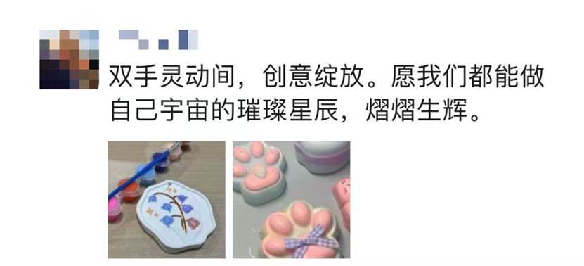 参与“春日芳华,静绽其华”活动的同学们,沉浸于温馨的节日氛围与精彩纷呈的活动之中,满怀喜悦地在朋友圈晒出自己的作品与收获,分享着幸福与感动。