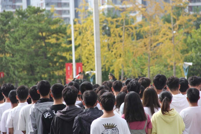 参加我校在综合楼前举行的喜迎国庆升旗仪式,全体辅导员老师、学生会主席团成员、大一新生代表出席仪式。