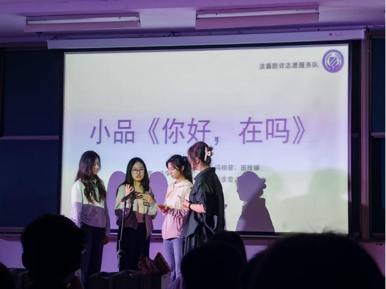 “法盾防诈”志愿服务队学子在与土木工程学院、文学与新闻传播学院、药学院联合举办的校级经典团日活动中演绎防范校园贷款诈骗小品。该小品深刻揭露诈骗分子利用大学生社会经验不足、金融知识薄弱的心理弱点,有效破除大学生“诈骗离我很远”的认知误区。通过生动的表演,将安全意识内化为理性消费、拒绝诱惑的行为准则,共同筑牢校园安全防线。