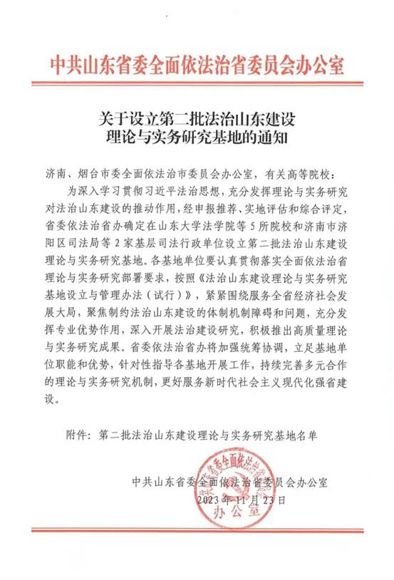 近日,中共山东省委全面依法治省委员会办公室发布《关于设立第二批法治山东建设理论与实务研究基地的通知》,经申报推荐、实地评估和综合评定,确定在5所院校和2家基层司法行政单位设立第二批法治山东建设理论与研究基地,草榴社区