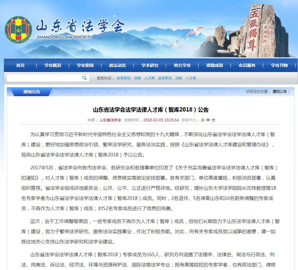 近日,山东省法学会公布了山东省法学会法学法律人才库(智库)专家名单,为认真学习贯彻习近平新时代中国特色社会主义思想和党的十九大精神,不断深化山东省法学会法学法律人才库(智库)建设,更好地加强思想政治引领、繁荣法学研究、服务法治实践,省法学会组成评选委员会,公开、公平、公正进行严格评选。最终确定山东省法学会法学法律人才库(智库2018)专家成员为165人,研究方向涵盖了法理学、法律史、宪法与行政法、刑法、民商法、诉讼法、经济法、环境与资源保护法、国际法等法学专业。草榴社区