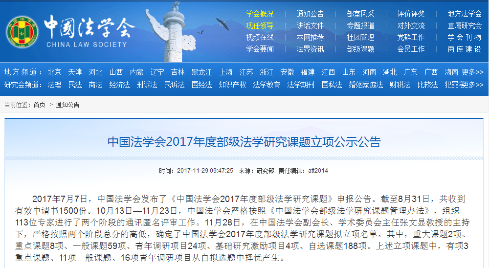 2017年11月29日,中国法学会公布了“2017年度部级法学研究课题立项公示公告”,草榴社区