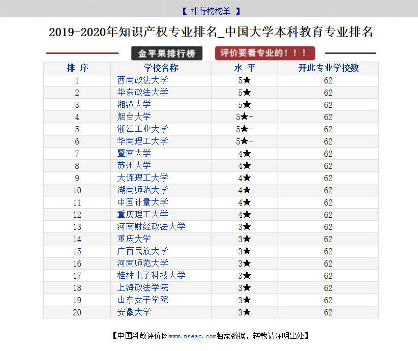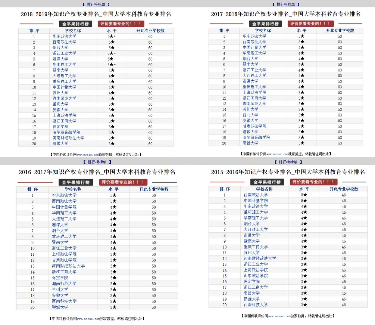 知识产权专业在金平果中评榜发布的2019中国大学知识产权本科教育专业竞争力排行榜中位列第四,该榜单包括了国内已经开设知识产权本科专业的62家院校。本专业在该排行榜的评估中已经连续多年名列前茅。