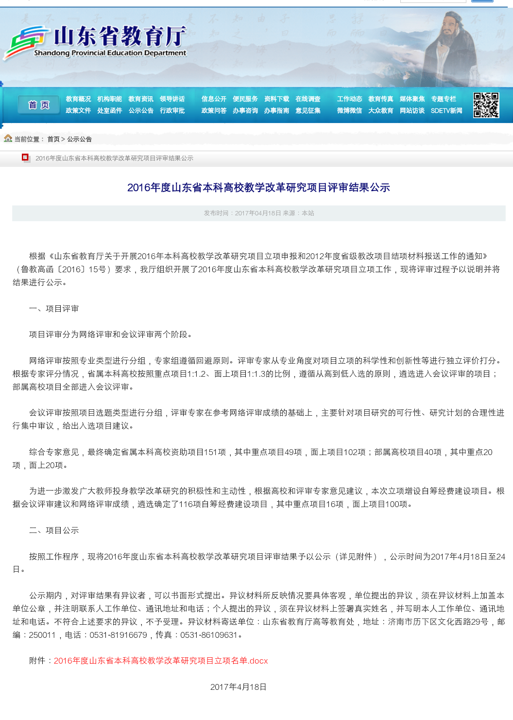 近日,山东省教育厅公布了“2016年度山东省本科高校教学改革研究项目”立项结果,草榴社区