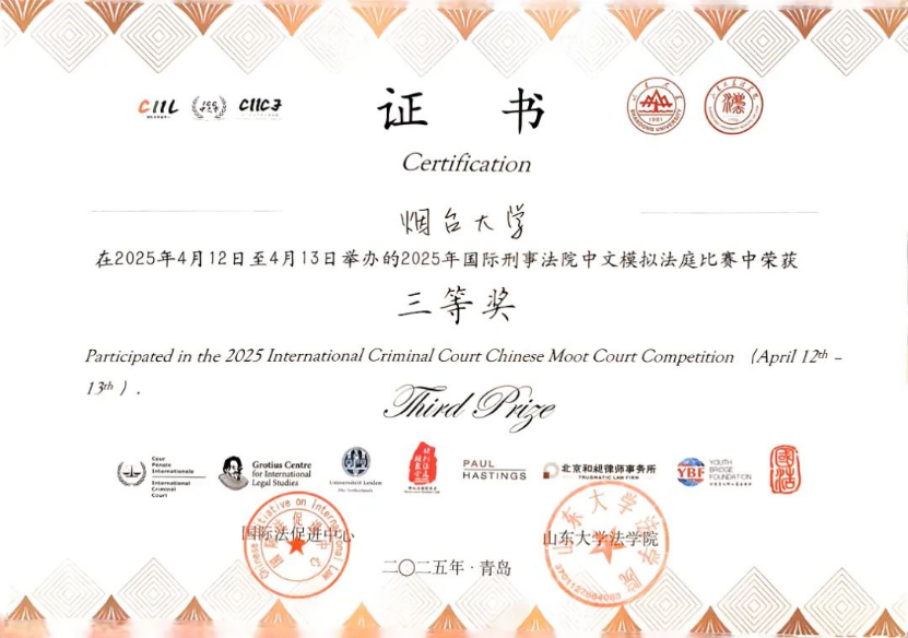 播种在2024年夏天的种子,在2025年春天开出了花。我们深知这份成绩不仅属于此刻,更属于过去数月与《罗马规约》相伴的每一个深夜。特别感谢赛队教练毛老师和三位学姐,你们以法律人的严谨一次次打磨我们的推论,坚持每个观点都必须有判例法源作为坚实支撑,才让我们最终能够呈现出一份经得起推敲的法律论证。未来有机会的话,我们“海牙见!”欢迎学弟学妹们加入烟大ICC的队伍,一起感受来自国际法精彩吧!