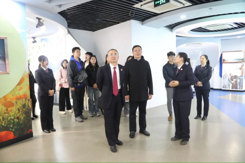 在张杰检察长的带领下,学院师生依次参观了检察宣告庭、法律讲堂、模拟法庭、宣告训诫室、青少年成长教育基地、心理疏导室和临界预防约谈室等。