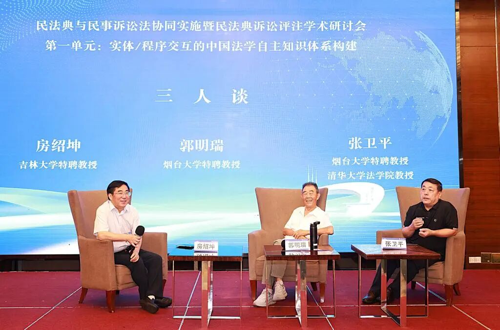 会上,我国民法学和民事诉讼法学研究领域著名学者郭明瑞教授、张卫平教授、房绍坤教授就“实体与程序交互的中国法学自主知识体系构建”话题,展开三人学术对谈。本次研讨会邀请10位法学类核心期刊编辑、24位法学教授、11位副教授和10余位青年博士,分为“实体/程序交互的中国法学自主知识体系构建”、“民法典与民事诉讼法的协同实施”和“民法典诉讼评注”三个主题,共六个学术单元进行学术交流。