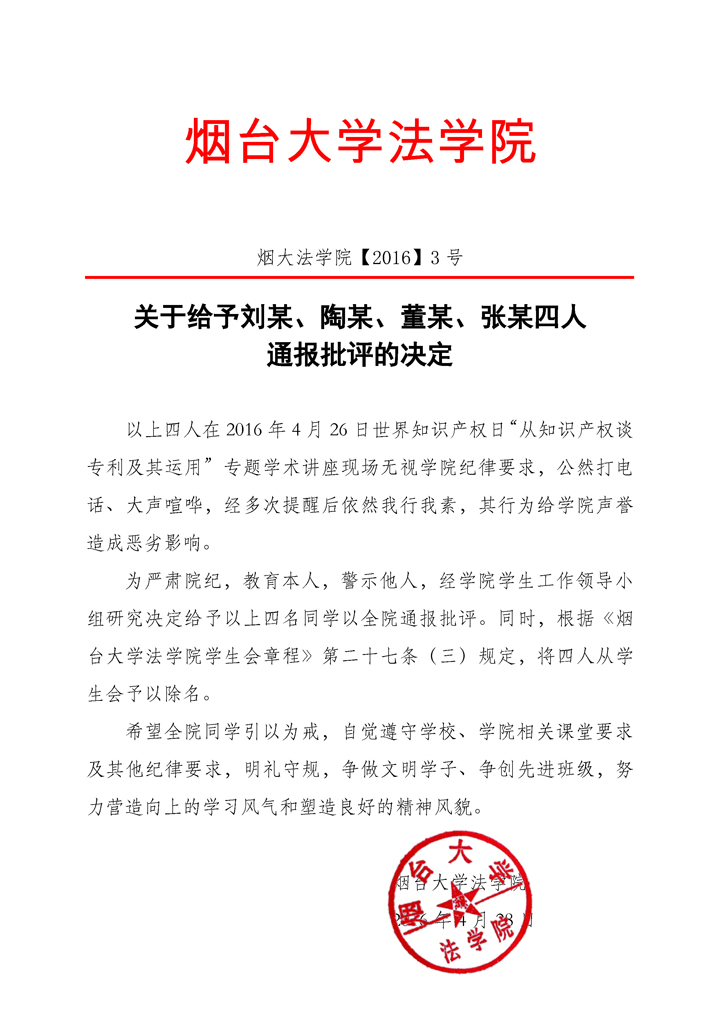烟大草榴社区 【2016】3号关于给予四名学生通报批评的决定