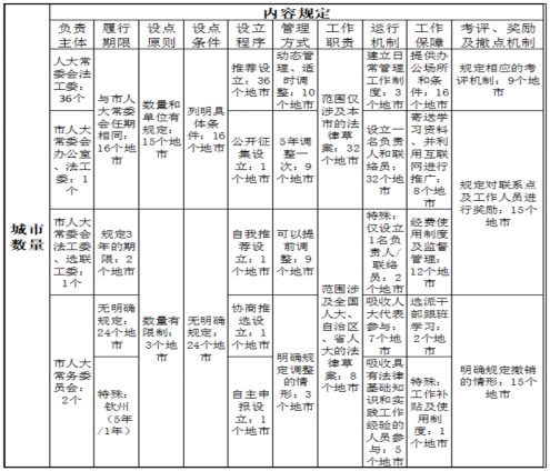 就负责主体而言,36个地市规定由市人大常委会法工委负责,蚌埠市负责主体为市人大常委会办公室和法工委,潮州市负责主体为市人大常委会法工委、选联工委,佛山市和连云港市负责主体为市人大常委会。就履行期限而言,16个地市规定基层立法联系点履行期限与市人大常委会相同。汉中市和龙岩市规定3年履行期限。钦州市因为分为一般基层立法联系点和特定基层立法联系点,所以分别规定了5年和1年履行期限。就设点数量而言,15个地市规定原则上每个县(市、区)各设立1个,并在积极参与地方立法活动的县(市、区)机关、乡镇(街道)、村(居)民委员会和涉及城乡建设与管理、环境保护、历史文化保护等方面的企事业单位以及高等院校、律师事务所等单位中选取部分单位进行设立。宜春市规定设点数量不能超过20个,淄博市规定设置数量一般为10个。就设点条件而言,16个地市总体概括了条件:(一)坚定正确的政治方向;(二)遵守宪法、法律、法规;(三)积极参与市人大常委会立法的各项工作;(四)在地域、行业等方面具有代表性和基层性。就设立程序而言,多数地市采取由市人大各专门委员会及常委会各工作机构、县(市、区)人大常委会和市直有关部门按照规定组织推荐,经市人大常委会法工委汇总和筛选后,报市人大常委会主任会议研究决定。但除了采取推荐设立的方式以外,百色市采取公开征集的方式设立;开封市采取自我推荐的方式设立;三亚市采取协商推选的方式设立;宜春市采取自主申报的方式设立,但明确规定数额不能超过20个。就管理方式而言,10个地市规定市人大常委会可以在任期内根据立法工作实际需要和基层立法联系点履行职责实际情况,动态管理、适时调整。9个地市规定每五年集中调整一次。3个地市规定了具体调整情形。就工作职责而言,40个地市都规定了参与本市立法工作的职责。但涉及法律草案征求意见、提出修改建议时,8个地市规定了向立法联系点征求意见。就运行机制而言,40个地市规定应当发挥本单位、本行业优势,拓宽联系渠道,创新工作方法,完善工作机制,提高工作能力,扩大社会影响等。3个地市建立了日常管理制度。7个地市注重发挥人大代表之家、人大代表联络站等作用。5个地市规定吸收法律基础知识和实践工作经验人员参与。就工作保障而言,16个地市规定提供办公场所和条件。8个地市规定定期发送立法工作信息和资料,发挥网络新媒体作用。2个地市选派机关干部跟班学习或者蹲点调研。12个地市规定经费使用管理制度。就考评、奖励和撤销机制而言,9个地市规定考评机制,15个地市规定奖励制度,15个地市规定撤销情形。